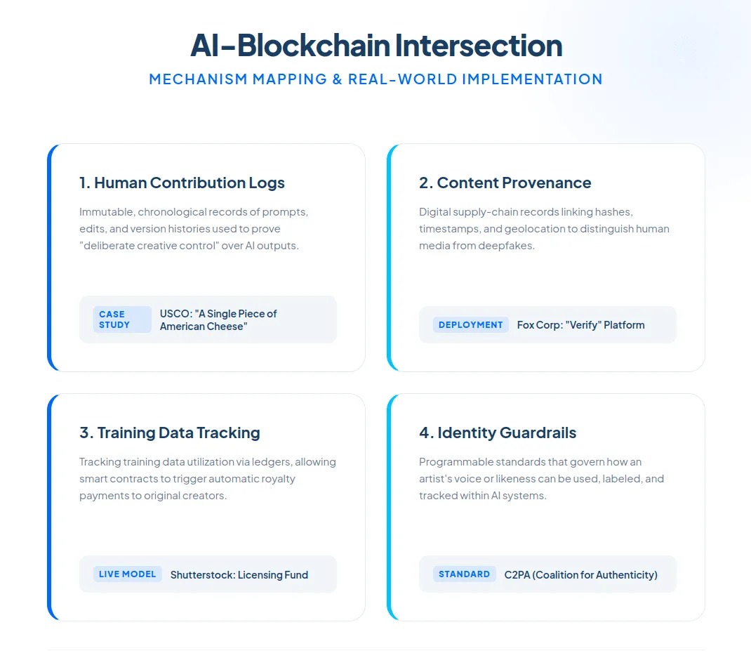 2. Establishing Content Provenance: As deepfakes and synthetic media proliferate, blockchain functions as a supply-chain record for digital facts. Linking files to cryptographic hashes, timestamps, and geolocation data, it helps distinguish genuine human-created content from AI-generated fabrications. Fox Corporation launched its Verify platform to authenticate original content and protect it from unauthorized AI training and reproduction.