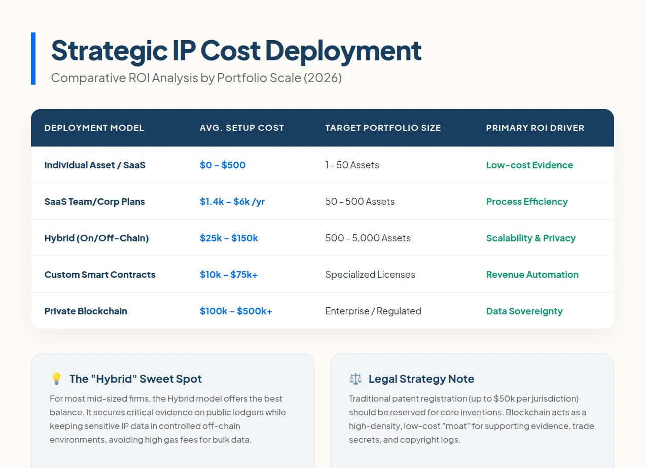 Traditional patent registration alone can cost $1,000 to $50,000 or more per jurisdiction. Blockchain offers a significantly more cost-effective alternative. Below is a breakdown of what blockchain IP tools actually cost in practice, organized by deployment model.