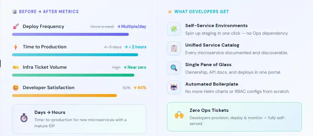 | Scalability | Toil multiplies as teams grow | Golden path scales without repeated effort |