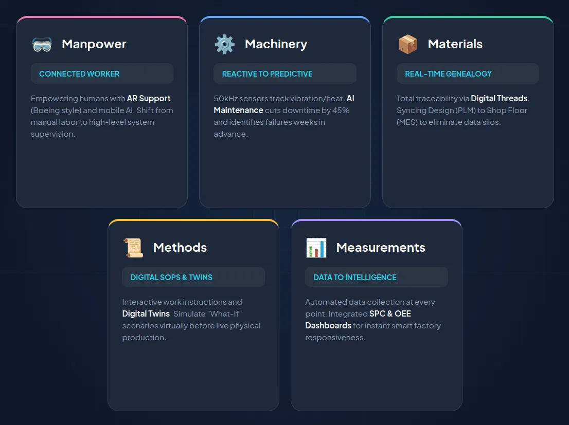 The 5 M’s of Manufacturing define a factory’s classic resources: Manpower, Machinery, Materials, Methods, and Measurements. In 2026, these categories are not just physical. A unified digital thread now connects the entire product lifecycle. Manufacturers integrate IT solutions like ERP, PLM, and MES. This process transforms raw shop floor data into actionable insights. These insights drive global competitiveness.