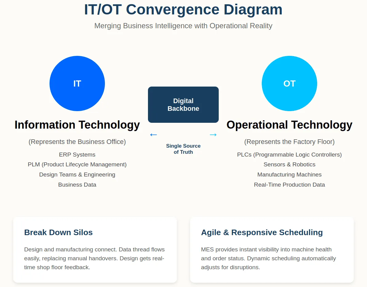 - The Big Picture: Manufacturing undergoes a crucial digital shift. The industry moves from isolated automation to integrated, autonomous production. This change fights an estimated $1.4 trillion loss from unplanned downtime yearly. IT acts as the cohesive digital backbone. It merges Information Technology (IT) with Operational Technology (OT). This establishes a single source of truth across the company.